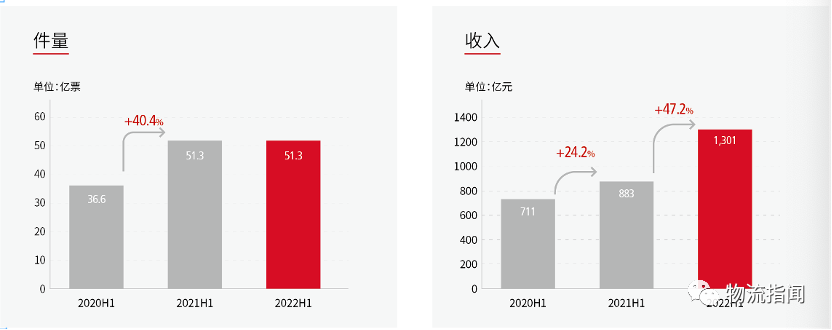 图:顺丰控股营收与件量对比图(2020H1-2022H1)