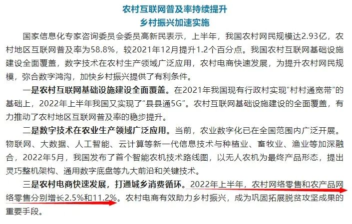 据介绍,2022年上半年,我国农村网络零售和农产品网络零售分别增长2.5%和11.2%。