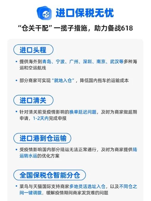 在进口货物入境后,对于疫情引发的换单延迟不能清关的问题,菜鸟协调各地海关总署及时为商家做超期申请,在1-2天完成申报;受疫情影响国内部分陆运无法正常通行,菜鸟积极沟通有关部门为运输车队办理通行证;在运力不足的情况下,菜鸟为商家提供陆运转水运的优化方案,保障港到仓运输时效“不掉队”。