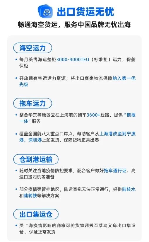 菜鸟整合华东等地区去往上海港的拖车近3600多条线路,提供“拖报一体”服务;此外,依托于菜鸟覆盖全国前八大重点口岸点的区位优势,可以帮助客户从上海港上船的货物改至到宁波港、深圳港,保障货物正常出港。