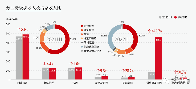 随着供应链与国际业务板块规模的快速扩大,顺丰控股新业务板块的占比大幅提升,从2021年上半年的占比31.1%增长到2022年上半年的51.2%,首次超过50%,顺丰多业务板块的结构更加均衡。