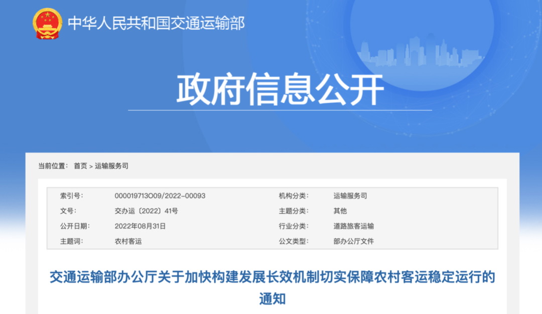 8月31日,交通运输部办公厅发布通知,要求加快构建发展长效机制,切实保障农村客运稳定运行。并请各省级交通运输主管部门于2022年9月30日前将保障本地区农村客运稳定运行情况及下一步工作安排报交通运输部。