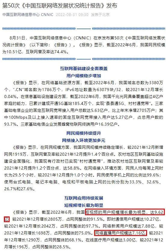 《报告》显示,截至2022年6月,我国短视频的用户规模增长最为明显,达9.62亿,