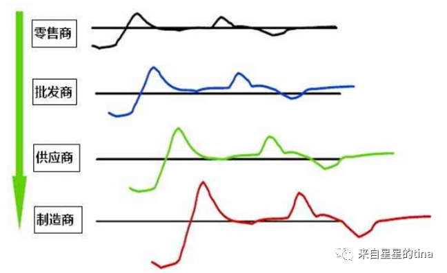 牛鞭效应,是经济学中的一个术语,它也被称为需求放大效应。牛鞭效应指的是当信息流从最终客户端传输到原始供应商时,信息共享无法有效实现,信息逐步失真和放大,需求信息看起来越来越波动,并且这种信息的失真在图中被放大,就像甩起的牛鞭一样,因此被称为“牛鞭效应”。