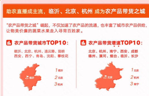 《报告》显示,2022年前八个月,快手农产品带货数量最高的十个城市分别为:临沂、北京、杭州、连云港、昆明、西安、西宁、青岛、沈阳、攀枝花。