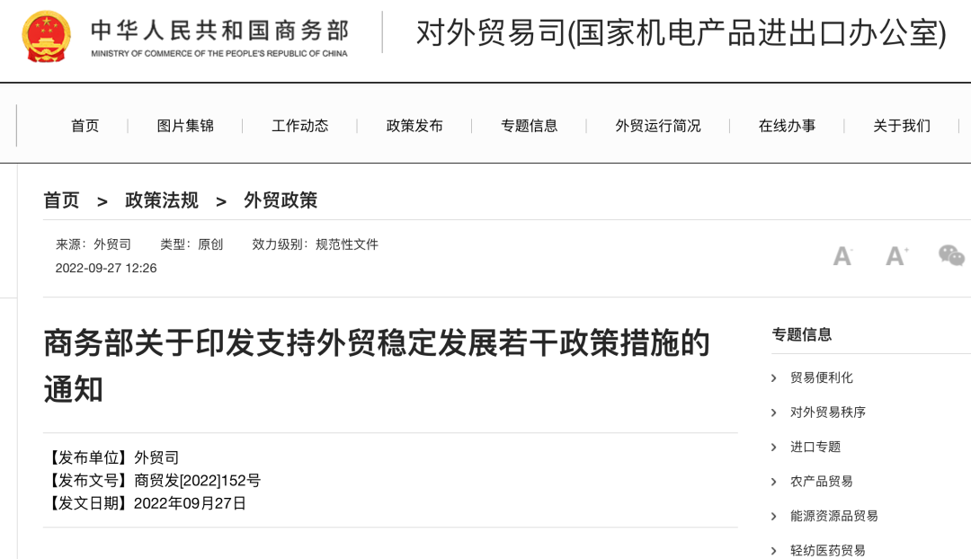 9月27日,商务部发布关于印发支持外贸稳定发展若干政策措施的通知。通知提出,进一步促进贸易畅通。提升港口集疏运和境内运输效率,确保进出口货物快转快运。保障产业链供应链稳定。持续清理口岸不合理收费,加强对港内及港外堆场等海运口岸收费主体监管。