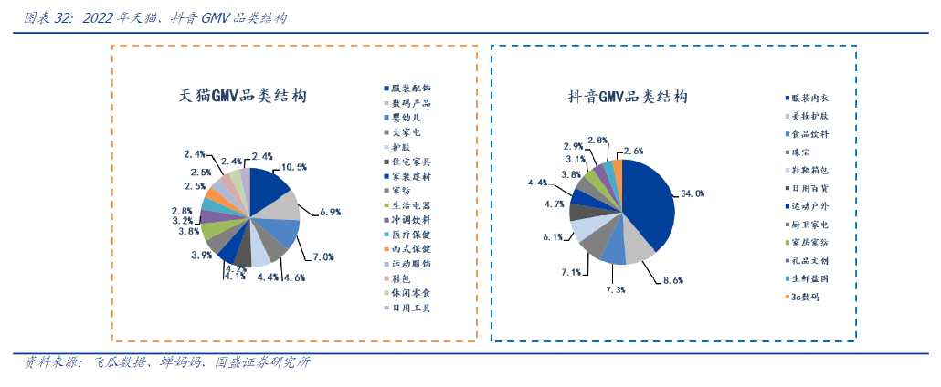 而货架电商的推出,能够帮助短视频实现“拓品”。相比传统平台较为均衡的品类占比,直播电商的产品形态更适合视频展示的非标品,而对其他品类渗透率不足。如在GMV品类构成中,抖音服装品类占比34%,而天猫最大的品类占比是10.5%。在标品中,数码产品能成为天猫第二大品类构成。而数码则是抖音GMV占比最低的品类。