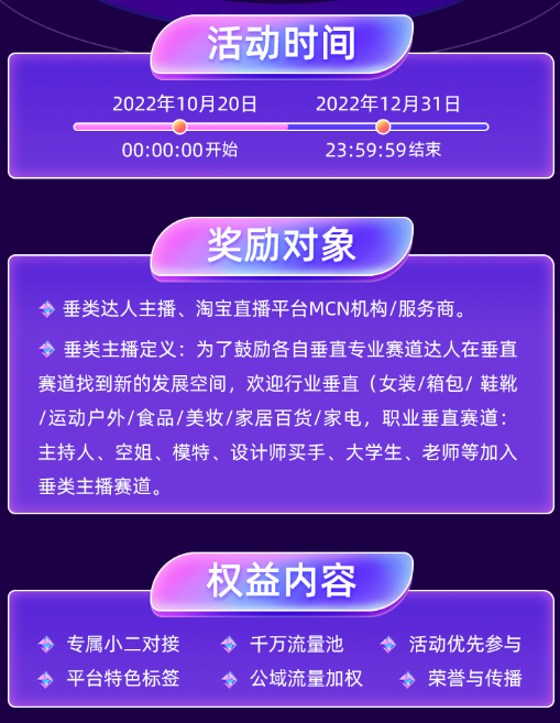 10月21日消息,淘宝直播发布了双11新的利好政策,并公布了《垂类达人激励总则》,活动时间为2022年10月20日至2022年12月31日。