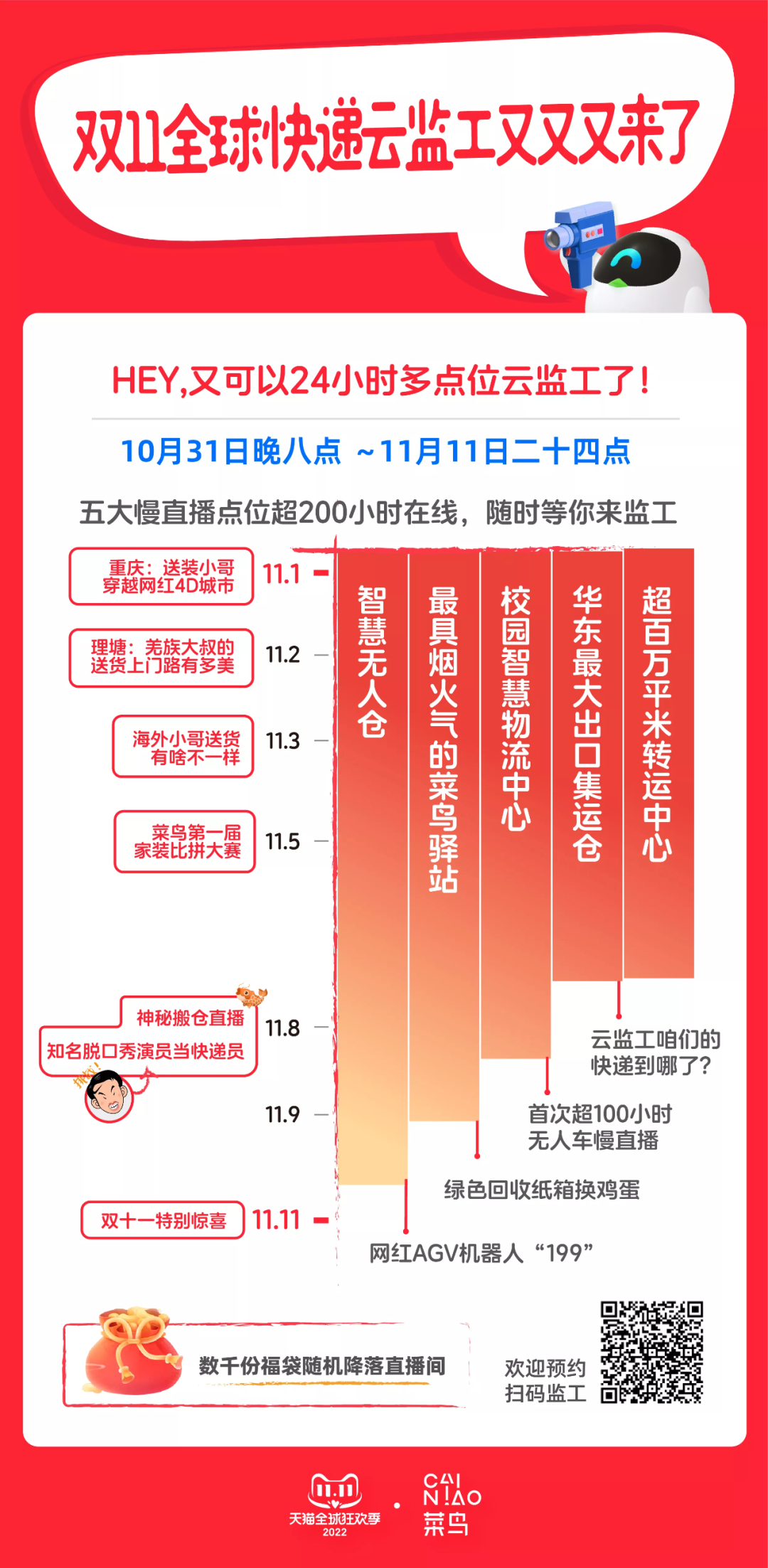 10月31日消息,记者从菜鸟方面了解到,随着2022年天猫双11在今晚(10月31日)8点的第一波开卖,菜鸟将同步为天猫双11全球消费者带来快递“云监工”直播,这也是其连续第三年上线全球快递“云监工”。今年的直播时间从10月31日晚8点到11月11日24点,将第一次实现多屏同框互动,慢直播镜头和特色直播过程一起看。