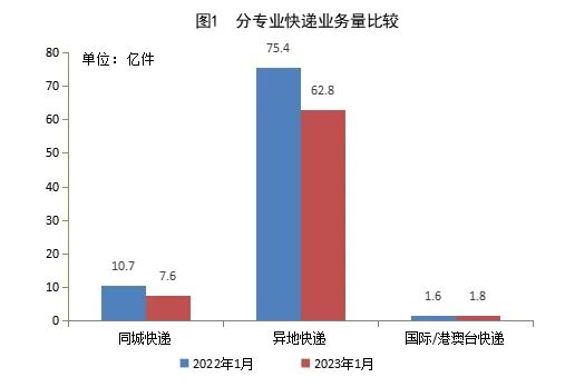 细分业务类别来看,1月份,同城快递业务量完成7.6亿件,同比下降28.8%;异地业务量完成62.8亿件,同比下降16.7%;国际/港澳台业务量完成1.8亿件,同比增长12.3%。
