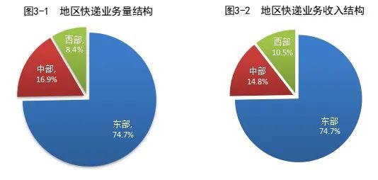 细分各个地区来看,1月份,东、中、西部地区快递业务量比重分别为74.7%、16.9%和8.4%,业务收入比重分别为74.7%、14.8%和10.5%。与去年同期相比,东部地区快递业务量比重下降2.5个百分点,快递业务收入比重下降1.9个百分点;中部地区快递业务量比重上升1.4个百分点,快递业务收入比重上升0.8个百分点;西部地区快递业务量比重和快递业务收入比重均上升1.1个百分点。