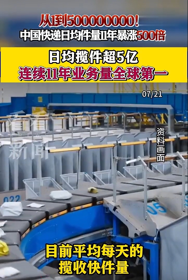 媒体报道日均揽件超5亿件!中国快递业务量连续11年居世界第一