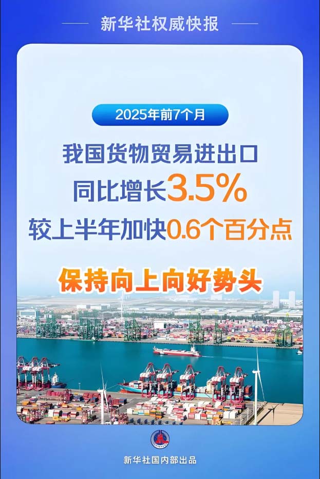 不妨先从最新“成绩单”中找寻答案。当天发布的数据显示,除了累计增速进一步加快,月度外贸表现也好于预期。7月单月,我国进出口同比增长6.7%,增速比6月加快1.5个百分点,创年内新高。其中,出口增长8%,增速连续5个月保持6%以上,进口增长4.8%,连续两个月增长。